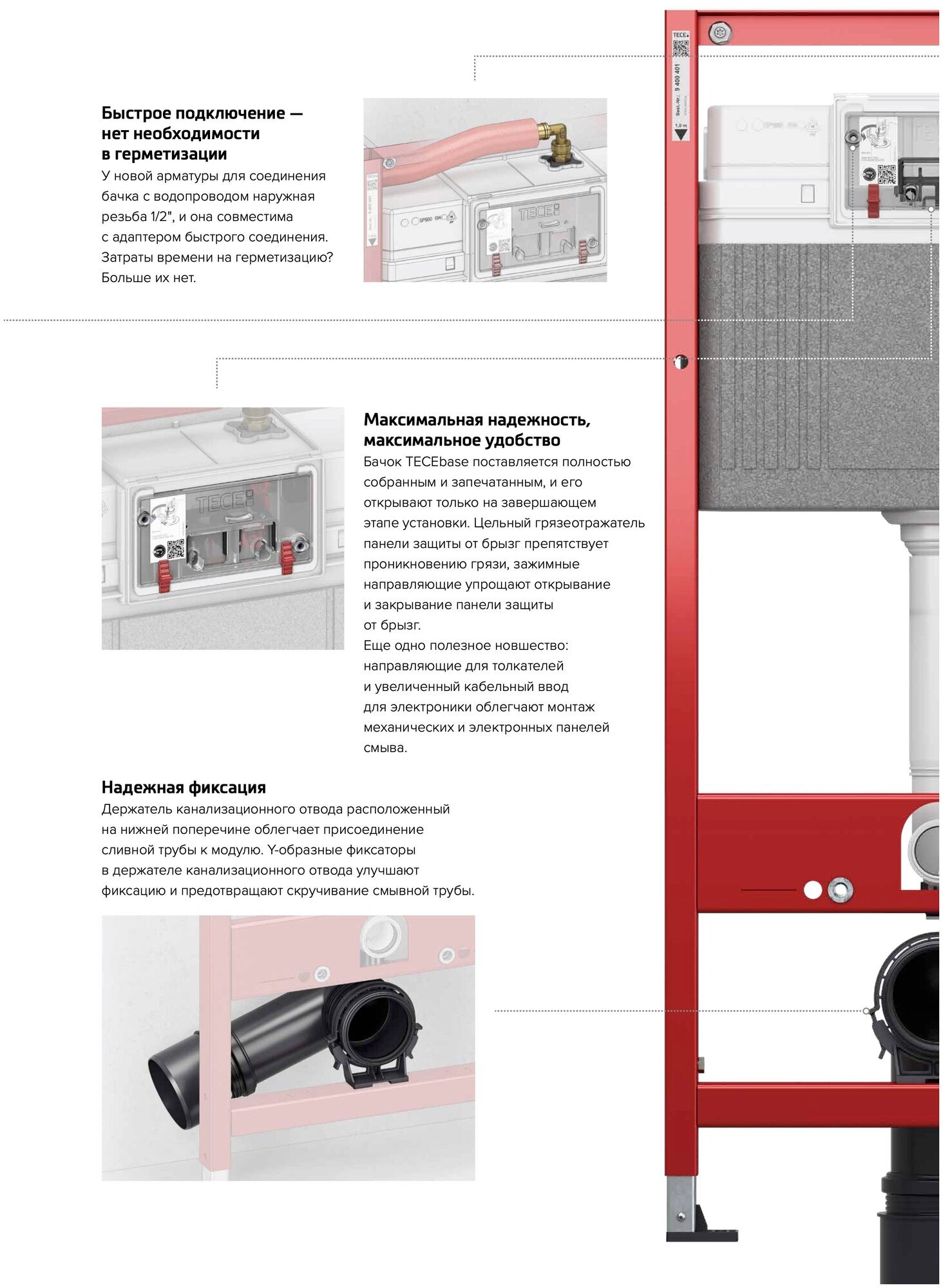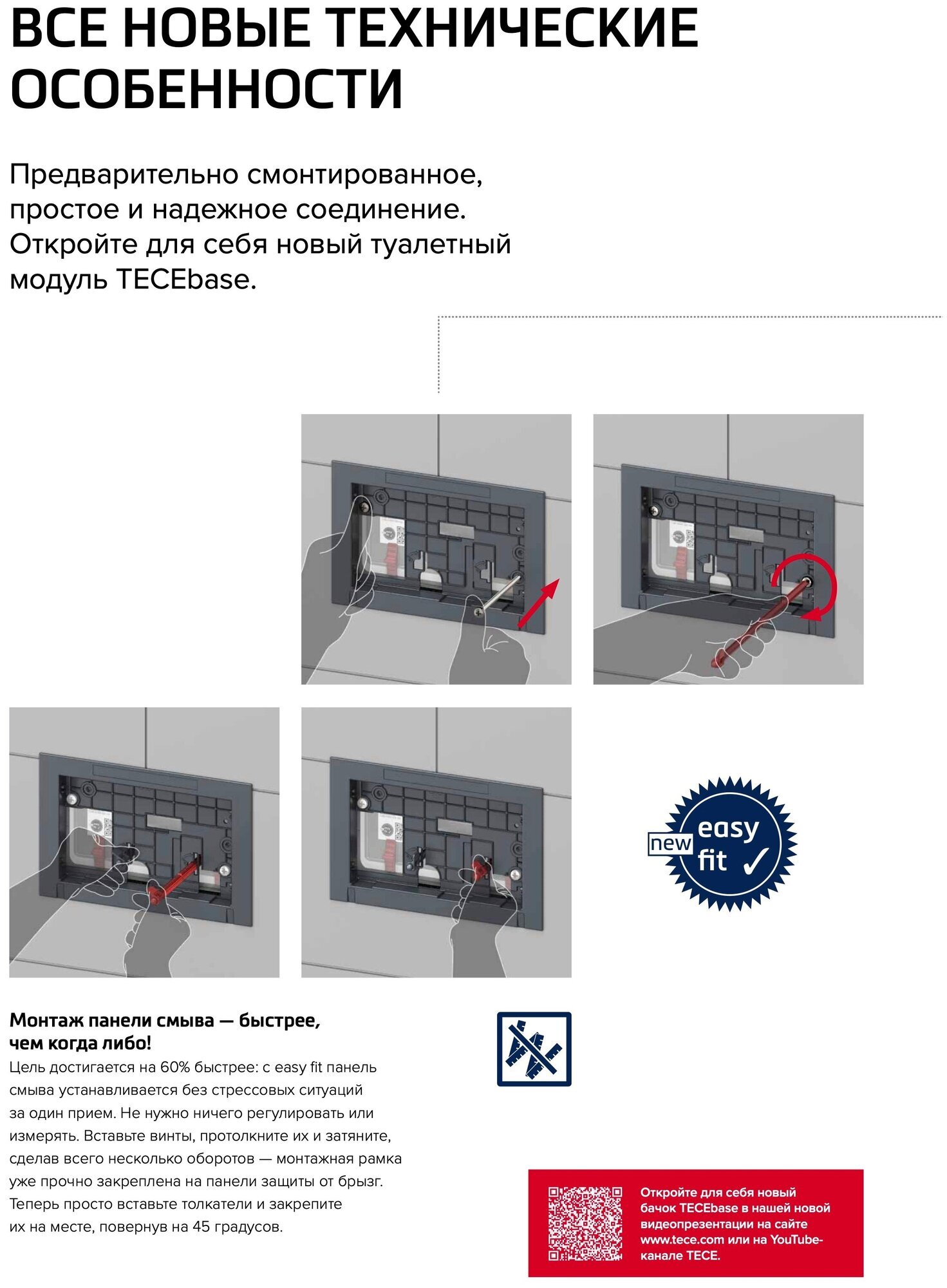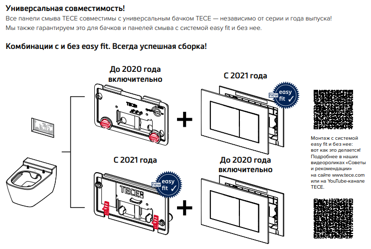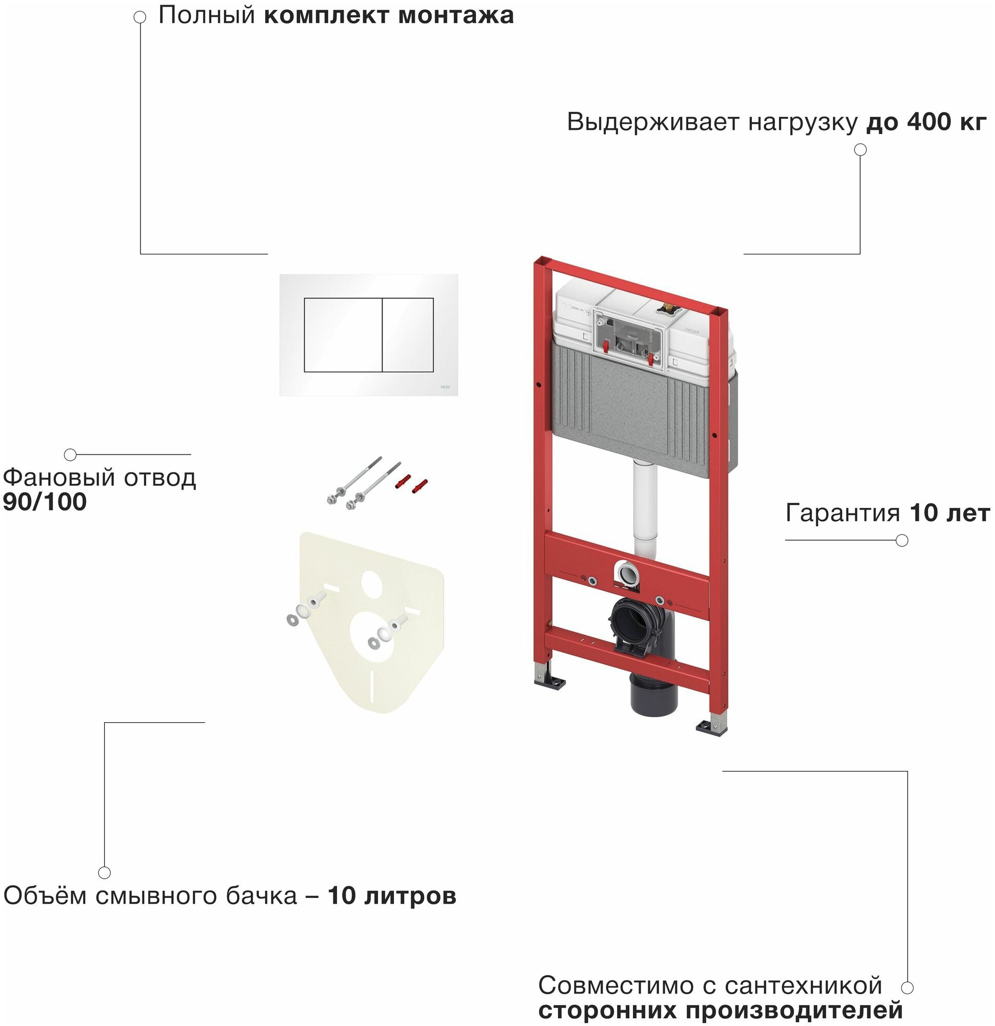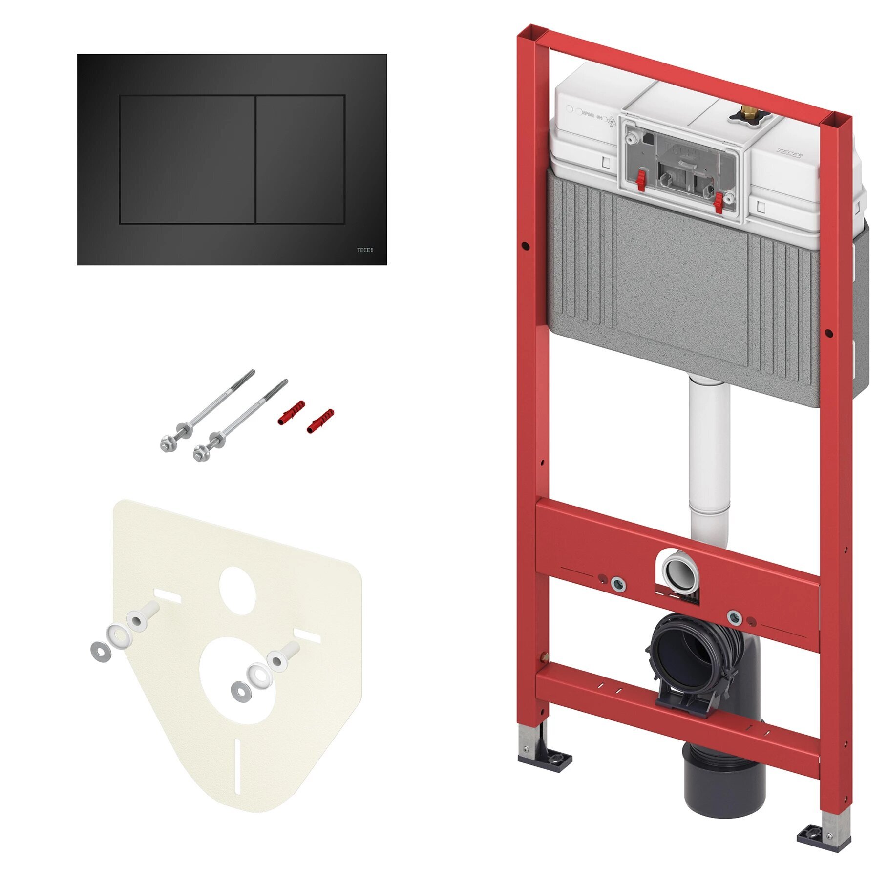 BASE 2.0 Комплект инсталляции 4 в 1 с панелью смыва ТЕСЕnow, цвет черный матовый, для установки подвесного унитазаКОМПЛЕКТАЦИЯ:- Застенный модуль TECEbase - размер застенного модуля: 112 x 50 x 16 см- Панель смыва (кнопка смыва) TECEnow, цвет — черный матовый.- Крепеж для монтажа модуля к стене.- Звукоизолирующая прокладка для унитаза.Обновление застенного модуля TECEbase 2.0 2021г.- Предварительно смонтированный заливной клапан с 3-ходовым угловым вентилем- Бачок не нужно открывать во время строительных работ- Улучшенная панель защиты от брызг- Быстрая сборка easy fit для панелей смыва- Можно модернизировать для унитазов с функцией биде- Оптимизированный держатель канализационного отводаУниверсальная совместимость!Все панели смыва TECE совместимы с универсальным бачком TECE — независимо от серии и года выпуска!Мы также гарантируем это для бачков и панелей смыва с системой easy fit и без нее.Максимальная надежность, максимальное удобство!Бачок TECEbase поставляется полностью собранным и запечатанным, и его открывают только на завершающем этапе установки. Цельный грязеотражатель панели защиты от брызг препятствует проникновению грязи, зажимные направляющие упрощают открывание и закрывание панели защиты от брызг. Еще одно полезное новшество: направляющие для толкателей и увеличенный кабельный ввод для электроники облегчают монтаж механических и электронных панелей смыва.Быстрое подключение — нет необходимости в герметизацииУ новой арматуры для соединения бачка с водопроводом наружная резьба 1/2", и она совместима с адаптером быстрого соединения. Затраты времени на герметизацию? Больше их нет.Застенный модуль TECEbase полностью готов к монтажу и установке повесного унитаза. Все необходимое дополнительное оборудование входит в комплект TECEbase kit. Модуль комплектуется бачком для воды объемом 10 литров. Конструкция сливного клапана позволяет регулировать большой объем слива - от 4,5 до 9 литров. Объем малого смыва составляет 3 литра. Материал бачка и технология его изготовления обеспечивает ударопрочность и стойкость к низким температурам.Доступ к содержимому бачка производится через отверстие для панели смыва, при этом все элементы внутренней конструкции легко извлекаются и обслуживаются.Использование подвесного унитаза вместо стандартного напольного экономит пространство в туалетной комнате и значительно упрощает процесс уборки помешения.Модуль TECEbase выдерживает нагрузку до 400 кг, что обусловлено конструкцией, надежностью используемых материалов и постоянным контролем качества.