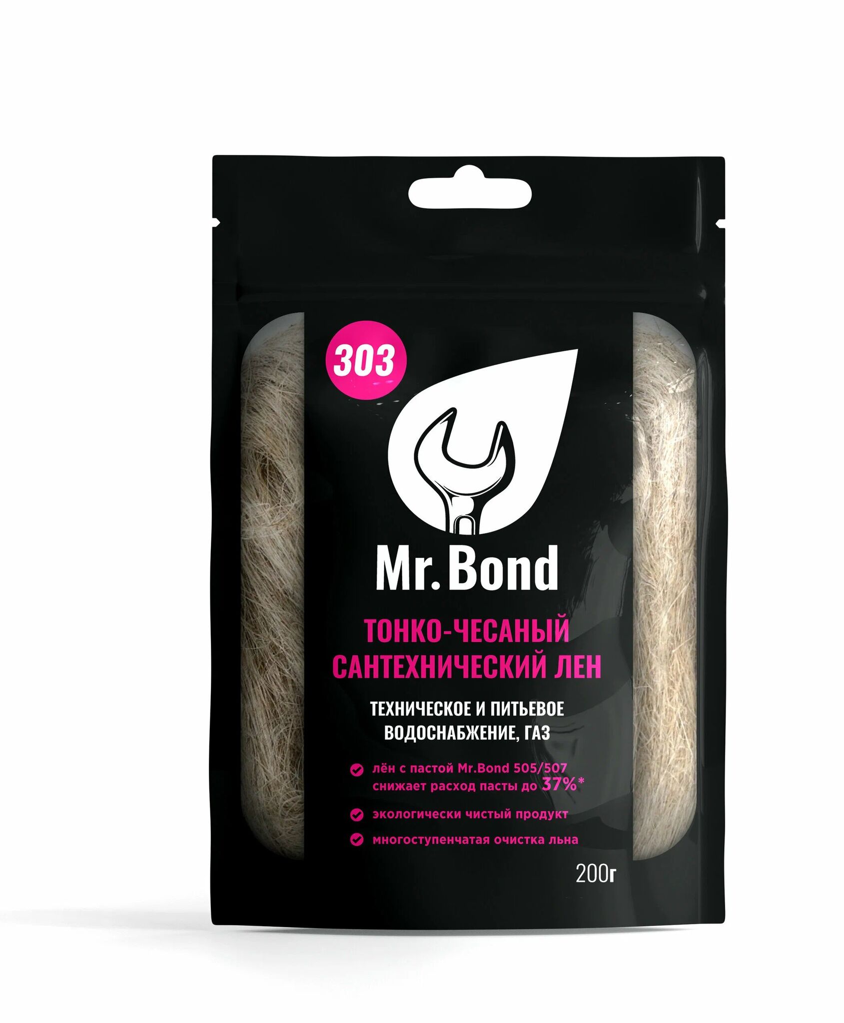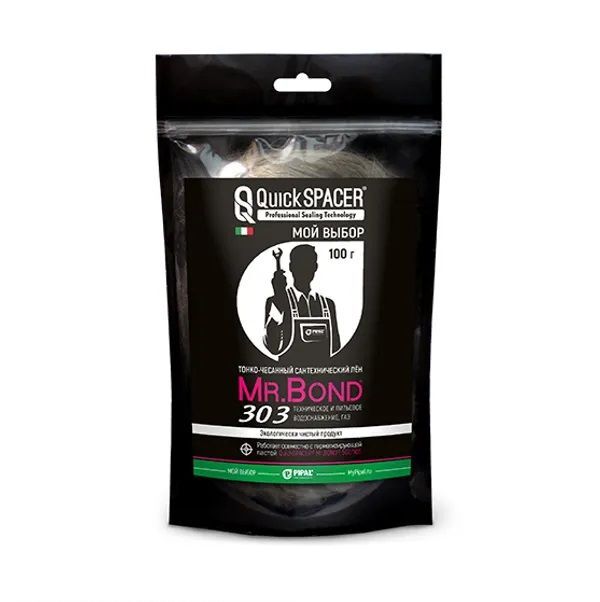 Сантехнический лён Mr.Bond 303 используется в техническом и питьевом водоснабжении. Лен предназначен для уплотнения и герметизации резьбовых соединений. Благодаря машинному вычесыванию и многочисленной очистке, лен обладает разглаженной текстурой. Сантехнический материал изготовлен из натурального длинноволокнистого льна, который собирается ручным способом. Для надежной герметизации следует использовать сантехнический лен вместе с пастой.