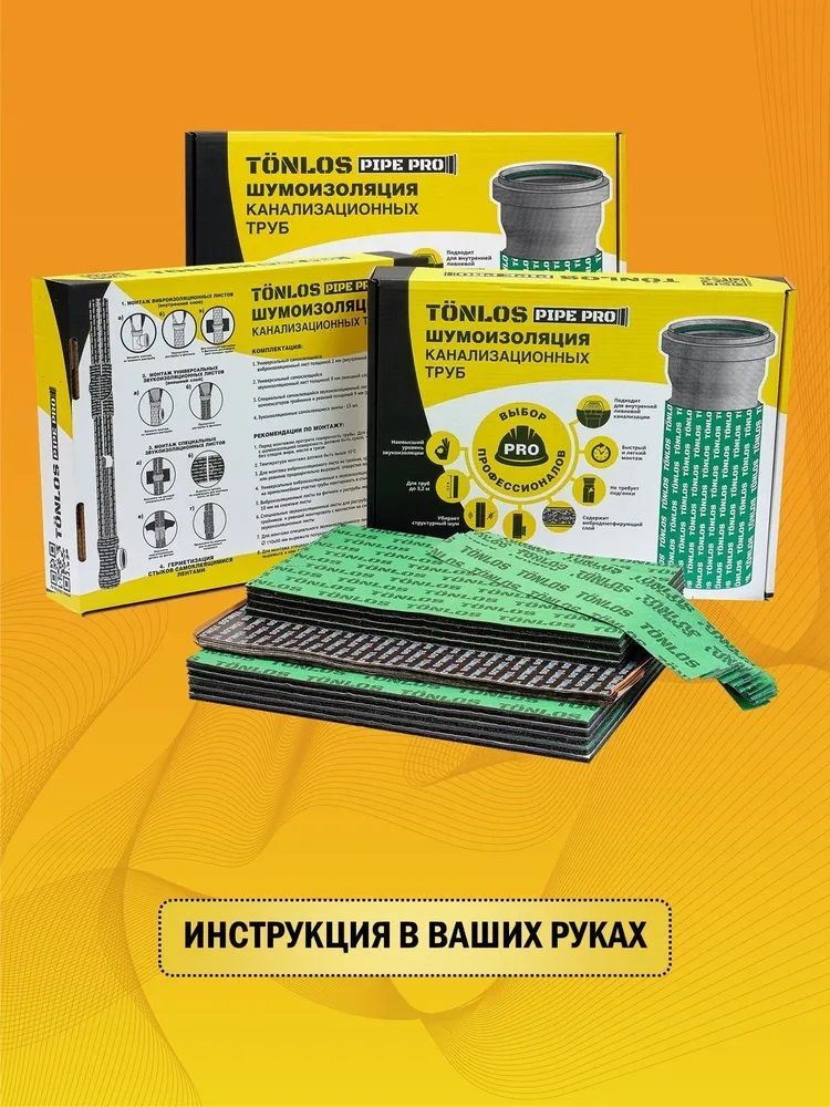 TONLOS Pipe Pro: универсальный виброизоляционный лист (внутренний слой) 365 × 500 × 2 мм – 7 шт, универсальный звукоизоляционный лист (внешний слой) 411 × 500 × 9 мм – 5 шт, специальный звукоизоляционный лист для раструбов и фитингов с перфорацией (внешний слой) 300 × 467 × 9 мм – 4 шт, звукоизоляционная самоклеящаяся лента 50 × 480 мм – 15 шт.
